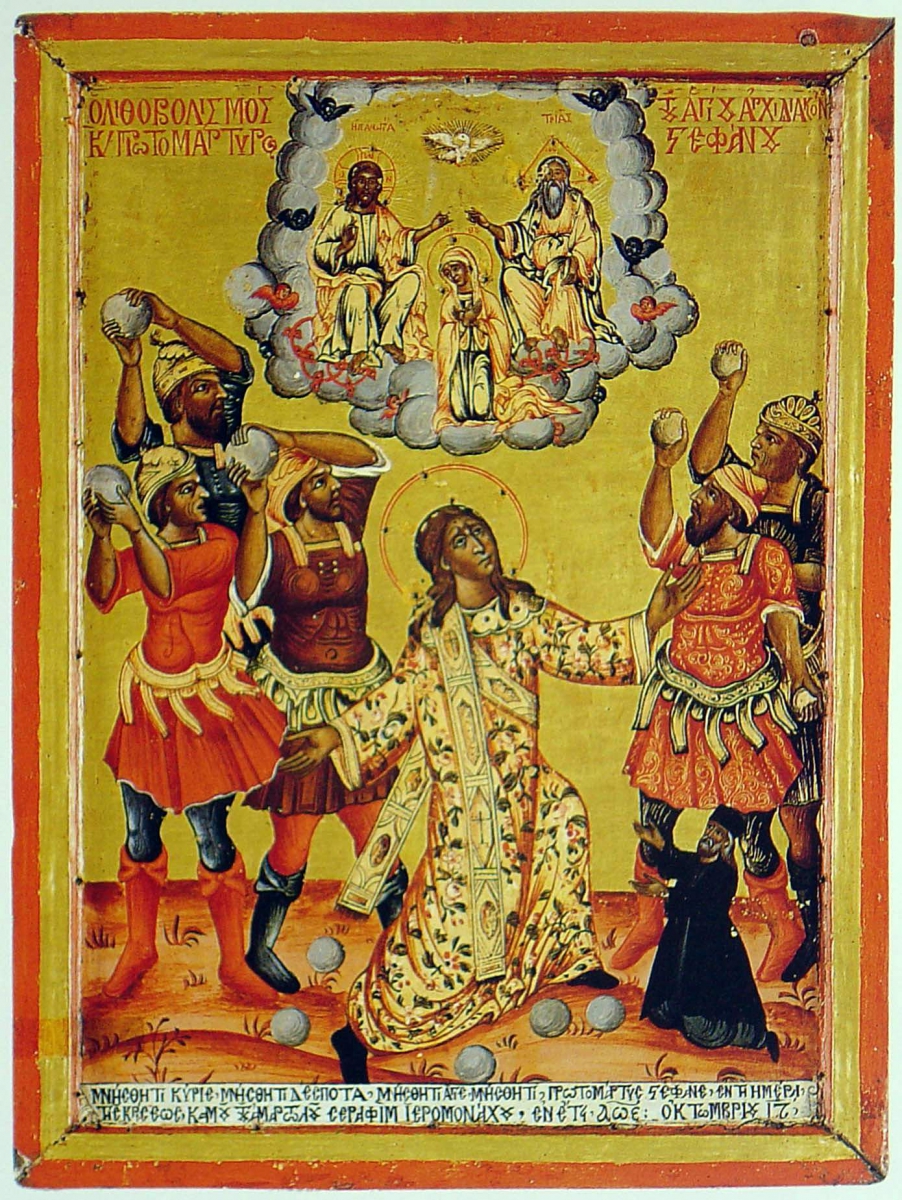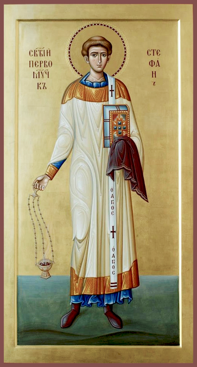 Первый во диаконех, первый и в мученицех показался еси, святый Стефане, апостоле, исполнь бо веры и силы во учении и в знамениих велик явился еси, и никтоже возможе противустати премудрости и духу, имиже глаголал еси, лице же твое на сонмищи видено бысть, яко лице ангела. Темже, исполнен Святаго Духа быв, видел еси отверстое небо и славу Божию и Сына человеча, Господа нашего Иисуса Христа, одесную стояща Бога Отца. Таже и от жестоковыйных и убийц иудеев камением пред лицем Преблагословенныя и молящияся о тебе Девы, Матере Его, побиваемь, преклонь колена, возопил еси гласом велиим: Господи, не постави им греха сего! И тако дух твой Господу Иисусу радостно предал еси. Сего ради молитвенника и предстателя тя стяжахом, колена души и сердца нашего преклоньше, тя молим: воздежи руце твои ко Господу, и сподвижи всему роду человеческому Предстательницу и Ходатаицу к Сыну Своему, Пресвятую Матерь Деву, и о нас, присно прогневляющих грехом и леностию, моли Благаго Спаса нашего, да подаст нам благодать во благовременную помощь к покаянию и твоим предстательством и заступлением Пресвятыя Матере Своея в день он, страшный и праведный, да не поставит пред нами грехи наша, но по щедротам Своим, тобою умолен быв, да речет души нашей: спасение ваше есмь Аз во веки веков. Аминь.