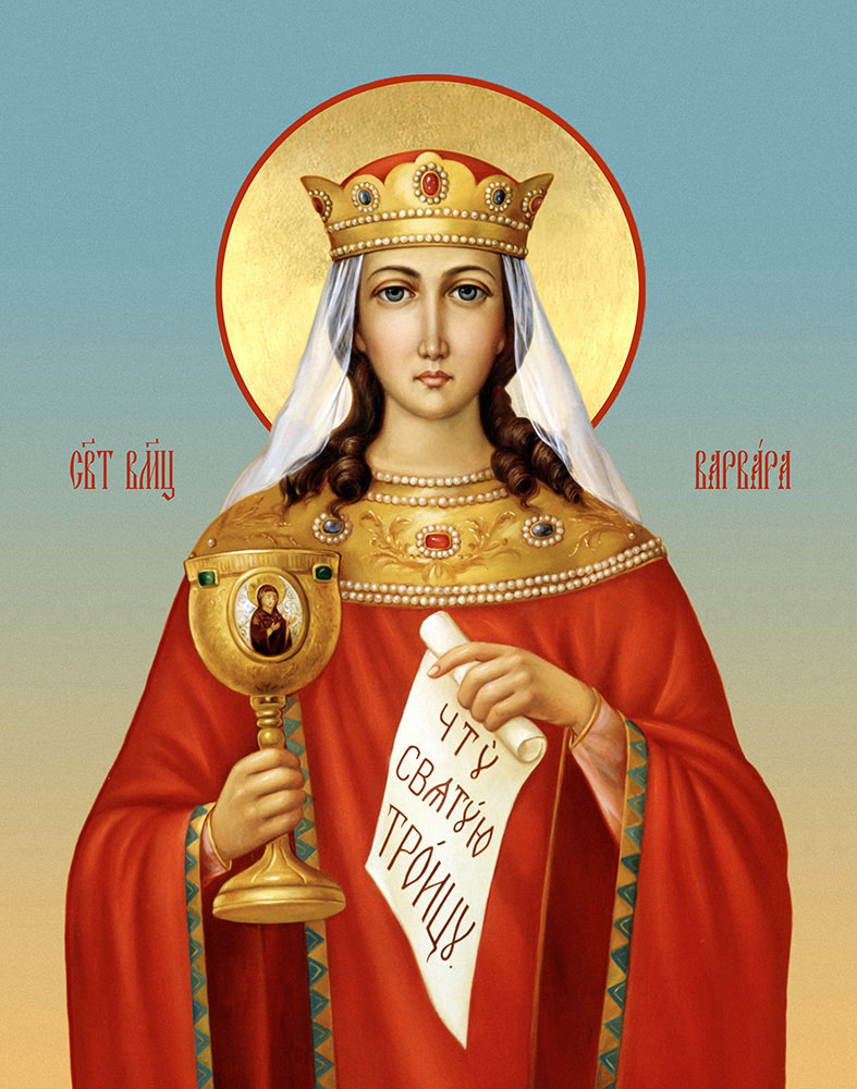 Святая Великомученица Варвара пострадала, претерпев множество мучений и пыток за Христа по злобе своего родного отца, который был язычником. Церковь сохранила предание о том, что перед своей казнью святая Варвара молила Бога о том, чтобы все, кто будут, вспоминая ее мученичество, обращаться к ней за помощью, были избавлены от внезапной смерти, без исповеди и Причащения Святых Христовых Таин. Господь принял просьбу мученицы. Поэтому святой великомученице Варваре молятся об избавлении от внезапной и насильственной смерти, о спасении от бури на море и от огня на суше. Также её считают покровительницей шахтёров и артиллеристов.
