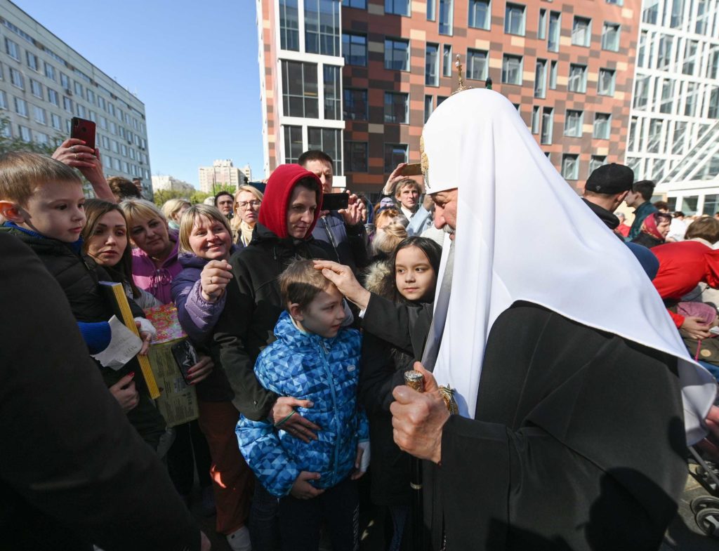Далее на площади перед центральным больничным корпусом 1А Святейший Патриарх Кирилл поздравил детей, находящихся на лечении, их родителей и сотрудников больницы со Светлым Христовым Воскресением: