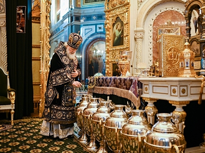 В Великий Четверток Предстоятель Русской Церкви совершил Литургию и чин освящения мира в Храме Христа Спасителя