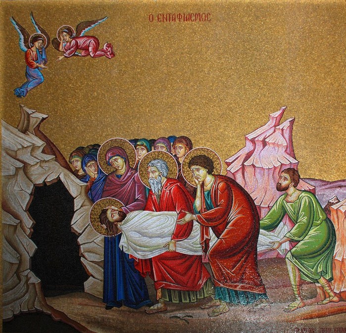 Сняв с креста и обвив пеленами с благовониями, по обычаю иудеев, Иосиф и Никодим положили пречистое Тело Господа в новом каменном гробе в саду Иосифовом, находившемся недалеко от Голгофы. К дверям гроба привалили большой камень. При погребении Иисуса Христа находилась Мария Магдалина, мать Иакова и Иосиева.