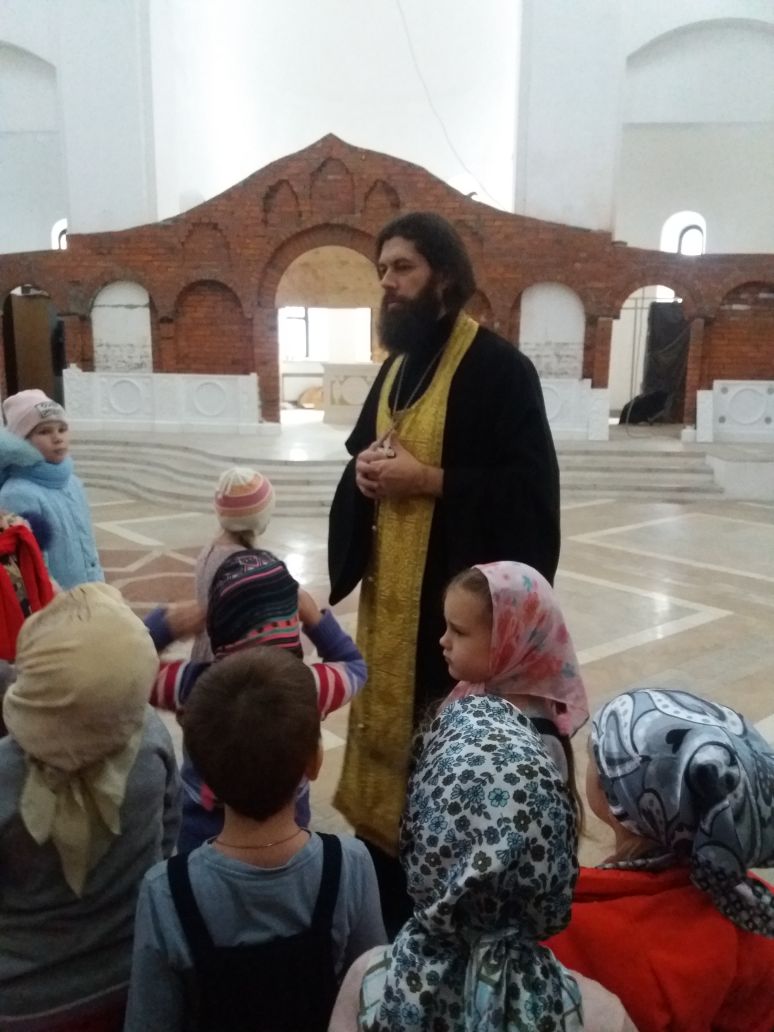 Отец Алексей рассказал детям об устройстве храма, показал священническое облачение, сосуды для совершения Литургии и напрестольное Евангелие. Все присутствующие поставили свечи и приложились к иконе праздника "Введение во храм Пресвятой Богородицы". Родителям батюшка говорил о том, что именно они первые воспитатели своих детей, от которых зависит какие добродетели будут заложены в души детей.