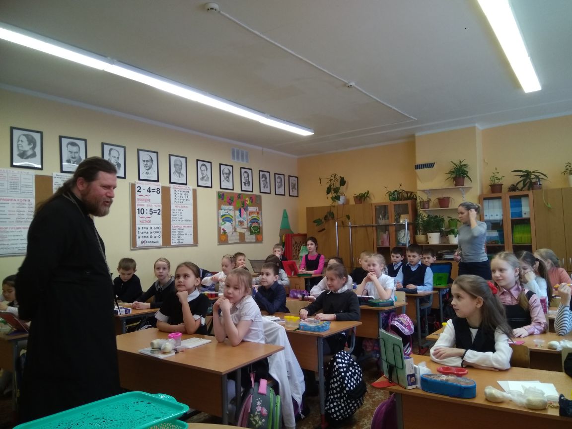 Клирик храма Новомучеников и исповедников Российских в Строгино иерей Илия Шелаев рассказал о Рождестве Христовом третьеклассникам, которых в общей сумме было под 60 человек. На 1 уроке ученикам 3 класса "А", классный руководитель Басова Татьяна Сергеевна, и на следующем уроке, ученикам 3 класса "Г", классный руководитель Мартынова Жанна Федоровна.