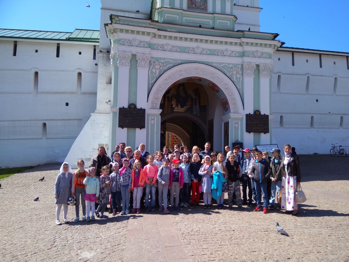 Дети и взрослые разделились на 3 группы, к каждой из них был прикреплен свой экскурсовод, который рассказал об основании монастыря, о подвигах преподобного Сергия Радонежского, о значении его личности в истории России. Рассказ подкреплялся картинами-росписями из жизни Преподобного, которые экскурсанты могли видеть на сводах и стенах Святых Врат. Дети увидели самый главный собор обители - Успенский, полюбовались фресками внутри него, поразились его величию; далее прошли в маленький Троицкий собор, где находятся мощи преподобного Сергия.