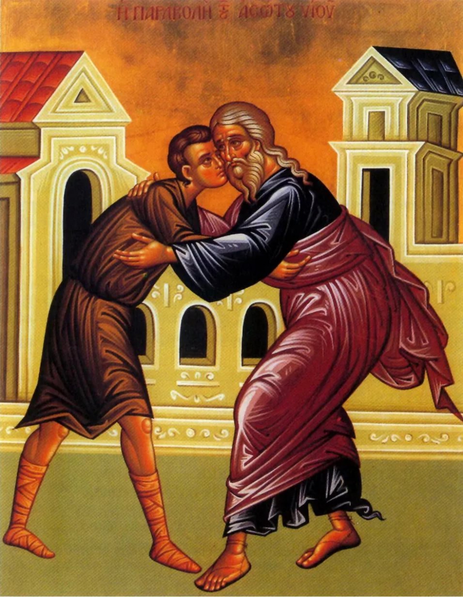 "От отеческой славы Твоей удалившись безумно, / я расточил в пороках данное мне Тобой богатство. / Потому вопль блудного сына обращаю к Тебе: / "Согрешил я пред Тобою, Отче милосердный, / прими меня, кающегося, / и поступи со мной, / как с одним из наемников Твоих!" Кондак триоди, глас 3 (перевод о. Амвросий (Тимрот)