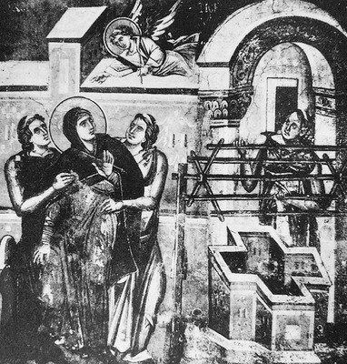 На иконе из храма Перивлепты в Охриде Богородицу поддерживают две служанки. В другом варианте Богородица изображается с мотком пряжи, т.к. Она участвовала в изготовлении новой завесы для Храма. Такой сюжет восходит к тесту Протоевангелия.