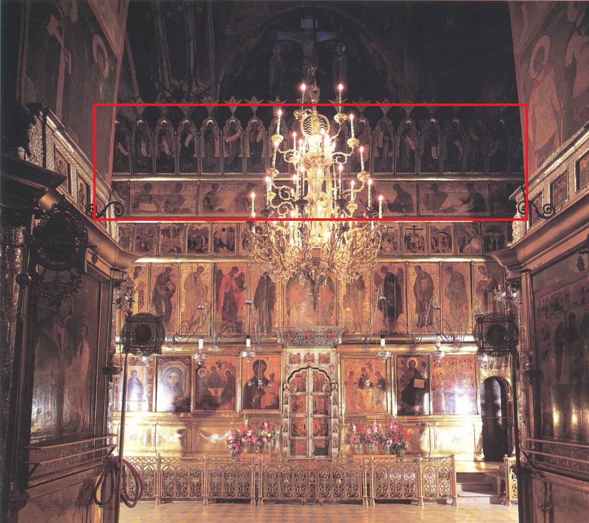 Особое место в иконостасе: верхние ряды. В руках могут быть свитки с цитатами.